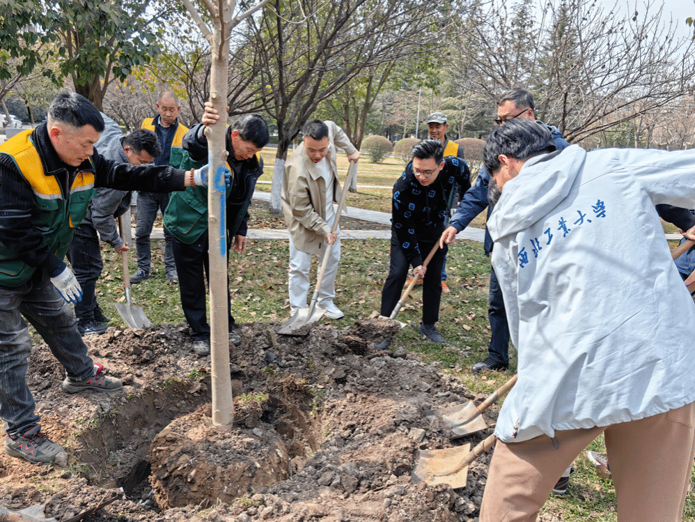 最是一年春光好,植树添绿正当时。3月12日,在毕业季来临之际,西北工业大学马克思主义学院和后勤产业集团物业服务中心共同开展“加强劳动教育 培育校友之林 种下共建之树”活动。学院党委副书记李刚、办公室主任郭雅楠、后勤集团物业服务中心主任羽渊、党支部书记周伟,以及学院机关党支部、后勤产业集团物业服务中心党支部、2024届毕业生,师生共同在长安校区马克思主义学院楼北侧种下一棵桂花树和一棵玉兰树。