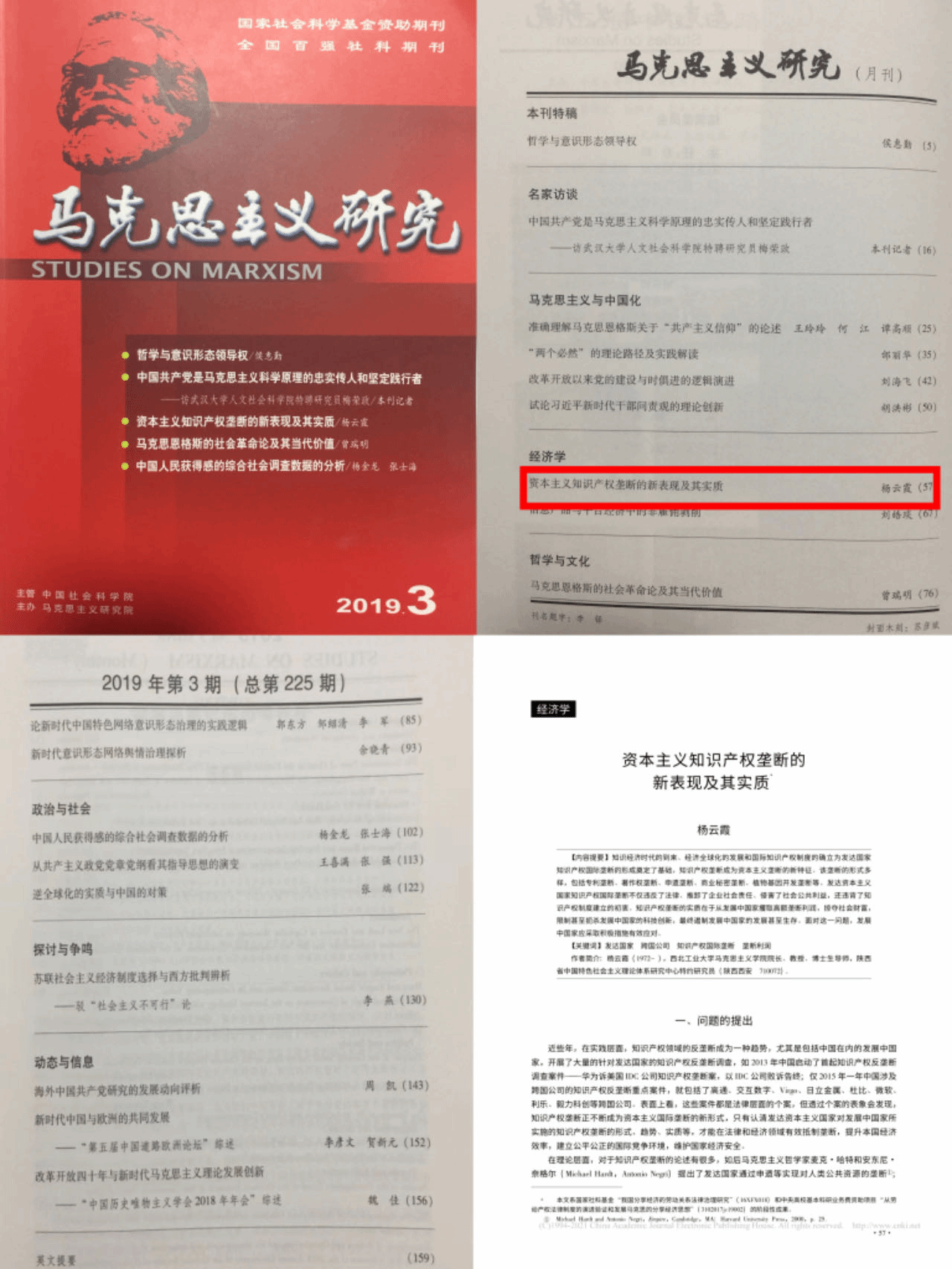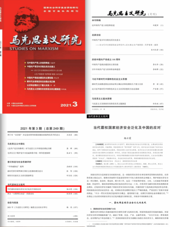 学院共发表学术论文470余篇,其中CSSCI论文近180余篇,中央“三报一刊”20余篇。高水平A级论文6篇,杨云霞教授在2019年《马克思主义研究》上发表《资本主义知识产权垄断的新表现及其实质》,揭示了发达国家所实施的知识产权垄断表征与本质,提出我国应采取的对策;2021年发表《当代霸权国家经济安全泛化及中国的应对》,深刻阐释了面对当代霸权国家经济安全泛化问题。