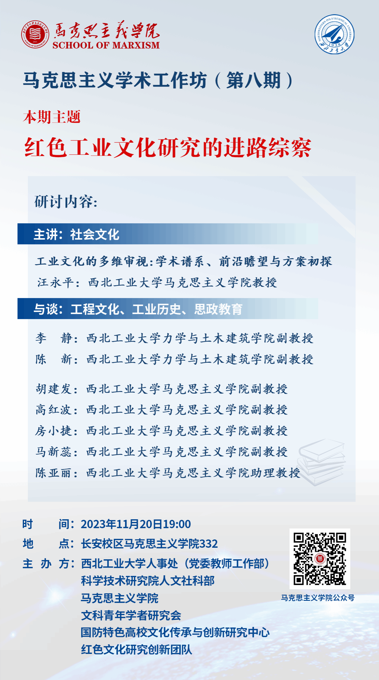 学院充分利用学术共同体凝智聚慧,与学校各部门联合开展“习近平新时代中国特色社会主义思想学习读书会”、“翱翔名家讲堂”、“人文与科技对话沙龙”等活动,不断加强思政课教师与学生的密切联系;有序开展科研团队活动,以老带新对青年教师进行帮扶和指导,创立的“当代马克思主义研究团队”被评为2023年陕西省高校创新团队;强化有组织的科研工作,将课题研讨会和学术交流会作为学术共同体的常态化工作,不断提升科研氛围,定期开展院内青年教师和学生学术活动,连续举办9期“马克思主义学院工作坊”,在校内营造良好的马克思主义理论研究氛围,并于2023年9月举办首次国际性学术论坛——第四届世界文化论坛,来自美国、英国、俄罗斯、希腊、加拿大、墨西哥等国外、国内专家学者、高校师生近200人参与了此次学术交流。