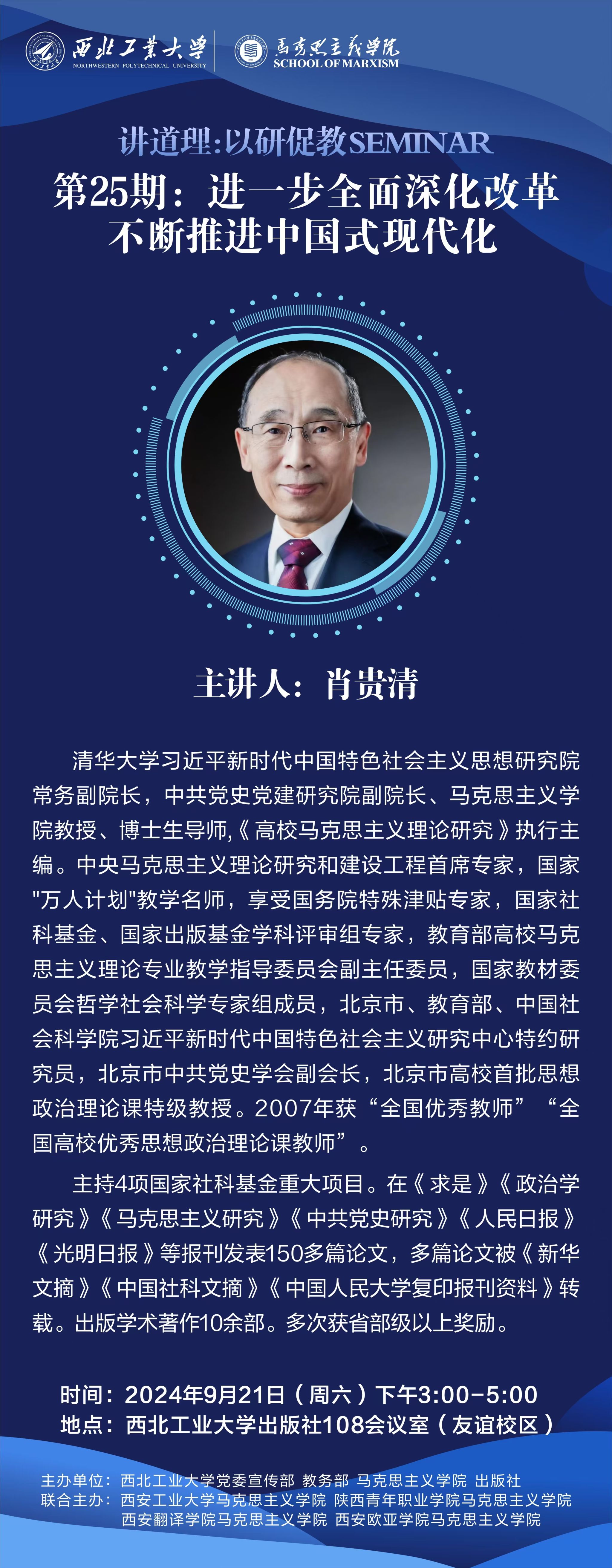 为深入学习贯彻党的二十届三中全会精神,提升西北工业大学思政课教师的以研促教水平,马克思主义学院创设的“讲道理:以研促教seminar”的第25期活动于2024年9月21日在西北工业大学出版社108会议室开展。活动特邀清华大学肖贵清教授以《进一步全面深化改革 不断推进中国式现代化》为主题,指导党的二十届三中全会精神融入思政课的集体备课,此次活动由西北工业大学党委宣传部、教务部、马克思主义学院和出版社主办,同时西北工业大学马克思主义学院对口支援单位的西安工业大学、西安翻译学院、陕西青年职业学院、西安欧亚学院等校马克思主义学院的师生也共同参加。马克思主义学院党委书记王彦革接待并感谢肖贵清教授来访,集体备课由马克思主义学院副院长贺苗主持。